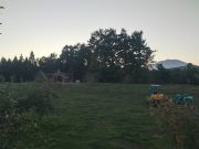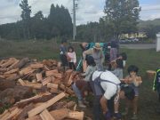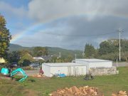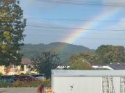 早朝から、家の掃除ぞうきん掛けをしてから、森林整備の薪割り作業。昼間は、幼稚園の子どもたちに手もらいもらい、薪の運搬作業。夕方、妻と2人で薪積みをしていると、見事な虹がかかった。