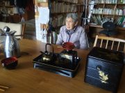 95歳になっても、一人で歩き 本を読み 歯が全て丈夫で 元気な母親とともに新年を祝う。美しい終日の大地からの景色。