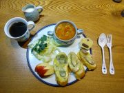 朝、地域のどんど焼きの準備を終えた後、豊かな朝食。もちろん、大地の石窯パン ソーセージ バジルのチーズトースト りんご ミネストローネ サラダ コーヒー をゆっくり味わう。その後、夕食に伺う予定のお気に入りのレストラン再開祝いのための蕎麦を打つ。