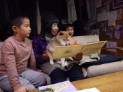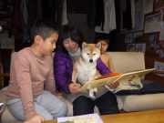 昨晩 お祭りの終わった夜、長男家族が夕ご飯を一緒に食べた。孫たちに絵本を読んでいたら、柴犬のムギも一緒に絵本を見ていた。