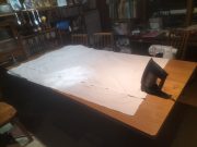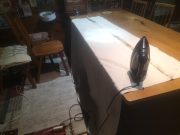 数年前に保護者に作っていただいたテーブルクロスが、現状の野外テーブルにぴったり合わなくていつも困っていたので、思い切って現状に縫いかえることに決定。木工と違い、まち針、アイロン ミシンと繊細な作業工程が要求される。当初は、他の人にお願いしようと思っていたが、やはり自分でやろうと決めたことは、何事もチャレンジ勉強だと思い、挑戦。寸法は長い板で鉛筆で線を引き、裁断。中表という言葉を知り まち針を打ち、スチームアイロンをかけ、いよいよミシン。下糸が切れたり、上糸がトラブったりしながらも、10枚を仕上げた。朝3時過ぎから7時までの忍耐でどうにかかかったが、充実感たっぷりの作業であった。