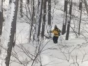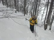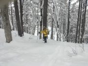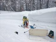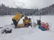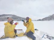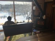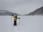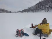 今朝も美しい夜明け。朝食は、おにぎりと味噌汁で雪景色と薪ストーブに囲まれて食べる。好天を予想したが、9時頃から雪。スノーシューツアーに出かける予定で、ホットサンドを準備したのに、断念して、大地の周囲でスノーシューーかと思っている間に、11時前には天候回復の兆し。再び準備して、車で30分ぐらいのお気に入りの湖へ出かける。積雪2メートル以上。その壁をスコップで切り崩し、這い上がって登り、スノーシューを履いて、膝まで埋まりながら湖へ。時折青空がのぞく無風の真っ白な大雪原。素晴らしい景色。湖の中央まで進み、昼食。ところが、朝の予定変更の混乱で、バーナーを忘れる!!!!!。それでも 暖かいコーヒーとおやつ、冷たいサンドイッチと素晴らしい景色の昼食を楽しむ。