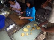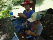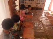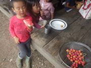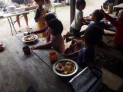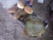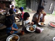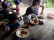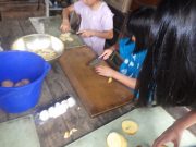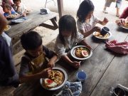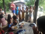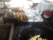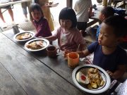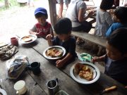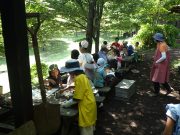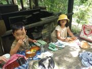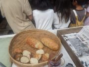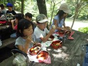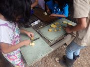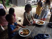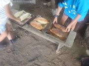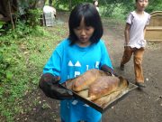 本日はフィッシュ&チップスの給食の日。パンは子どもたちが、練り上げから石窯まで全てをやり通し、素晴らしい石窯パンが完成。フィッシュは、白身の魚を、ビールでまぶした衣をつけて、本格的に竈で揚げた。子どもたちが掘ったジャガイモを子どもたちが切り、これを竈であげ、天草の塩をかけて完成。大人気かつ本格的なフィッシュ&チップス。デザートは、スイカを食べて、大満足の給食。
