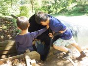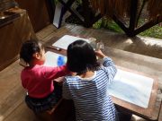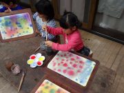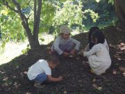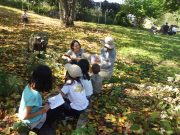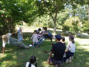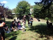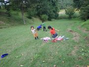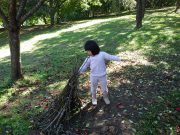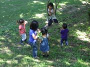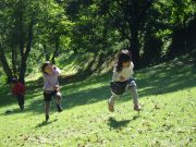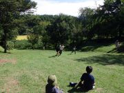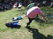 ソリで滑り降りたり、大玉を転げていったりと、スロープ傾斜地ならではの競技に笑い転げる。大人の尻尾を子どもたちが追いかけたり、斜面を利用して紙飛行機を飛ばしたり。