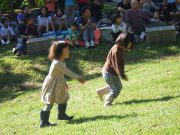 全員の童歌遊びに始まり、大地のスロープを駆け上るという事から始まる。父親 母親 小中学生 園児 と走る。