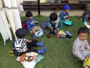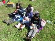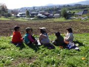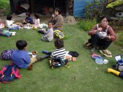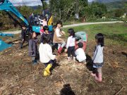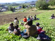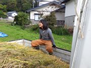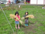 先週末、手刈り稲刈りが終了して、その丸ける作業が進行中で、その束をはざ掛けするために、子どもたちがそれを運ぶ作業を畑で楽しんだ。秋晴れの中、黄金色の稲束と子どもたちの姿が美しい。