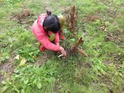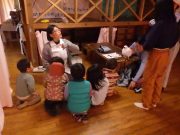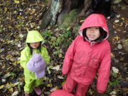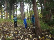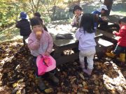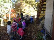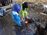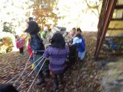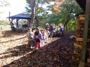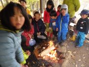 週明け。落ち葉いっぱいの森を散歩し、薪をたくさん集めてきて、あちこちで焚き火を楽しむ。うちわ片手に、皆が火起こしを楽しんでいる。