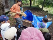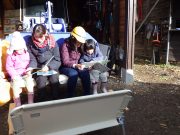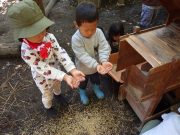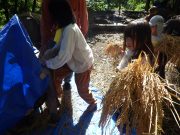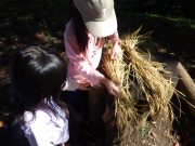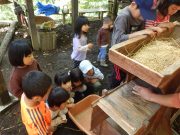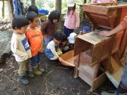 稲刈りが記録的に遅かったので、本日ようやく脱穀となる。ぎーこちゃんととおみちゃんを使い、もち米の脱穀を楽しんだ。とくに、唐箕の音は、ぎーこぎーこと鳴るので、ぎーこちゃんと呼ばれ、その人力における動きは、子供たちの人気である。