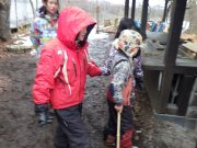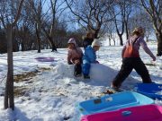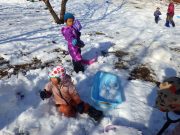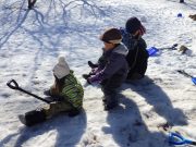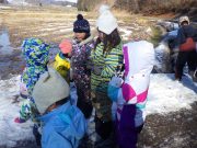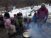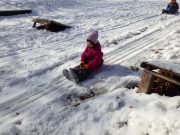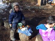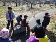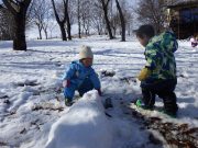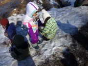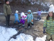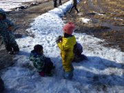 雪が残る田んぼに出かけ、雪や氷とたっぷり遊んだ。昨年に比べて雪は少ないが、子どもたちは、雪さえあれば、遊びの世界が広がる。