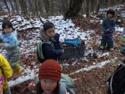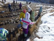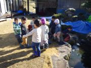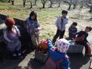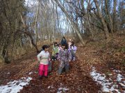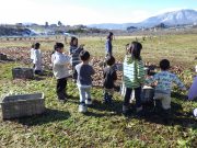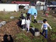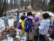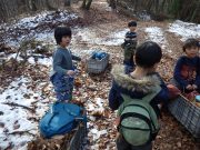 2学期最終日。落ち葉をリンゴ箱にひもをつけて作ったそりにたっぷり積めて、不耕起の畑へ出かけ、たっぷりと落ち葉を入れて覆った。暖かい日差しに元で畑に感謝。日だまりの中、お弁当を食べて、無事2学期が終了した。