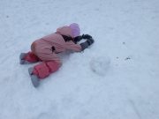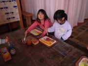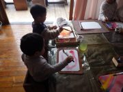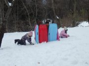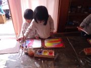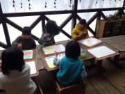 2学期開始。皆 元気に登園。雪は少ないが、まだスロープは全面雪。午前中 にじみ絵を愉しんだ後は、スロープで雪遊び そり滑りで愉しんだ。