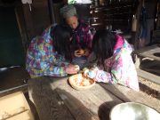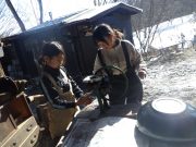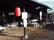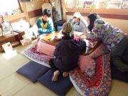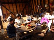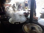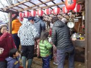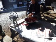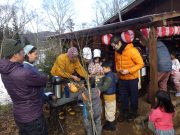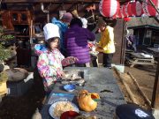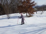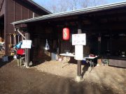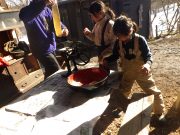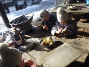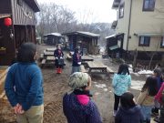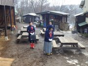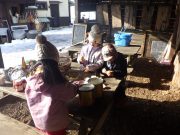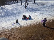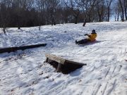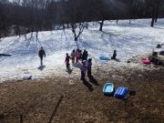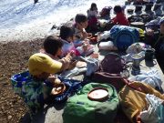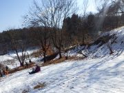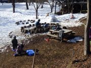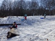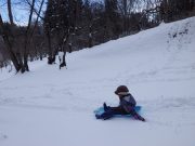 昨日からの気温の上昇で、かなり雪解けが進み、スロープの半分ぐらいが地肌があらわれる。春のような日差しの中で、たき火をしたり、ソリ遊びをしたりで、春を思わせる陽気である。