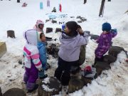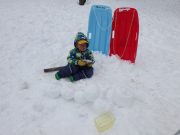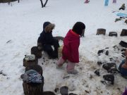 だんだん雪が溶けてきているが、たき火をしたり、ソリをたてて、家づくりをしたりして雪遊びを愉しむ。