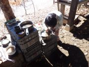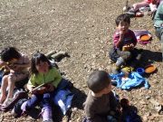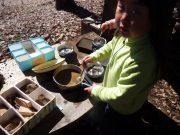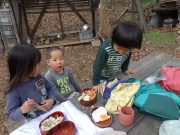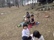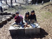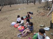 暖かさのお陰で、子ども達の大好きな砂場が全面的に遊べるようになり、2ヶ月ぶりの砂場が大盛況。たっぷり砂場遊びを満喫し、そのまま、春の日差しの中でお弁当を楽しむ。だいちの