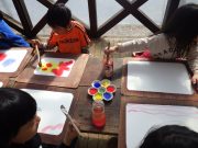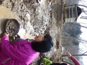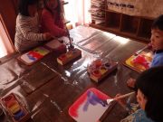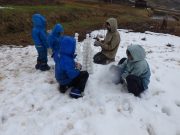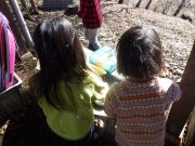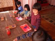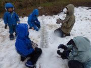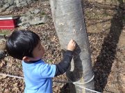 暖かさが続き、すっかり大地のスロープからは雪が消えてしまった。週明け、にじみ絵を楽しんでから、枯れ落ち葉でいっぱいのスロープ、土が乾いてきて、子ども達は、転げまわったりしながら、春の日差しの中で遊んでいる。