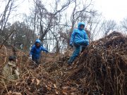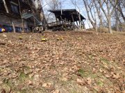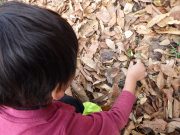 大地の丘は、枯れ葉がいっぱい敷き詰められている。そんな落ち葉は絶好の遊び場となる。斜面で転げ回るのはもちろん、遊び材料になるにはうってつけである。ジャンバーも脱いで、春の装いで遊んでいる。