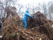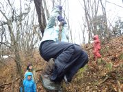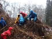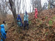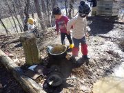 スキーウェアから雨具の衣替えをして、森の中に散歩に出かける。倒木に登ったり、蔓にぶら下がったり、残雪を見つけて遊んだりしている。