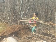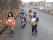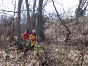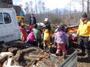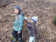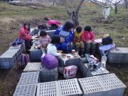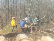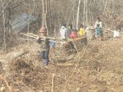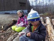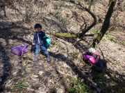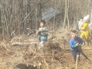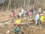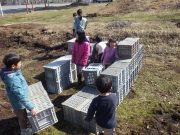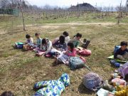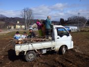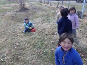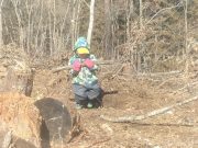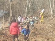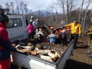 昨年秋に伐採した森から、チップ用の材木を運び出す。斜面 切り株 蔓 などの荒れ地の中を、子ども達は何度の何度も運び出している。森の横の広々した野原でお弁当を食べ、午後も作業を楽しんでいた。