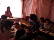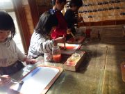 年齢毎ににじみ絵を楽しんだ。大きい子ども達は、カーテンの洗濯、フック付け カーテンレールとりつけなど、普段できないような日常の暮らしのポイントを楽しんでいた。