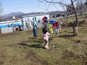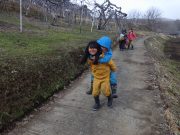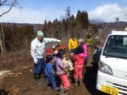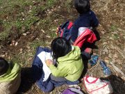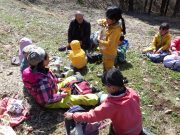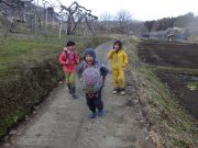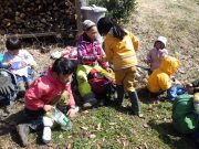 年齢別保育日。大きい子ども達は、お弁当持ちで芋川神社方面まで終日出かける。年少児も同じく、終日山を歩いてきた、未満児は、砂場を独占して思う存分、水と泥で遊んでいた。