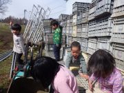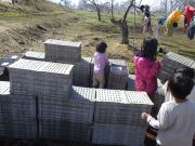 昨日に続いて、森のチップ用材木の引き出し。そして、その後は、最近人気のリンゴ箱積み木 リンゴ箱家作り リンゴ箱迷路などの遊び。そして、車庫の屋根での遊び。やはり、子どもは遊びの天才だ。